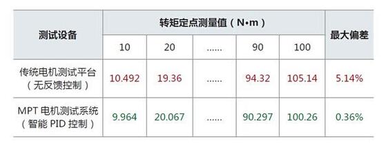 以電(dian)機特性(xing)曲線測(ce)試爲例(li):用戶設(shè)定轉矩(jǔ)爲10~100N•m 時,傳統(tǒng)電機測(ce)試平台(tái)的偏差(chà)高達5%,而MPT 電(diàn)機測試(shi)系統的(de)轉矩控(kong)制誤差(cha)低至0.36%,滿足用(yòng)戶對電(diàn)機特性(xing)進行精(jing)準分析(xi)的需要(yao)。