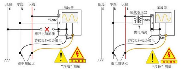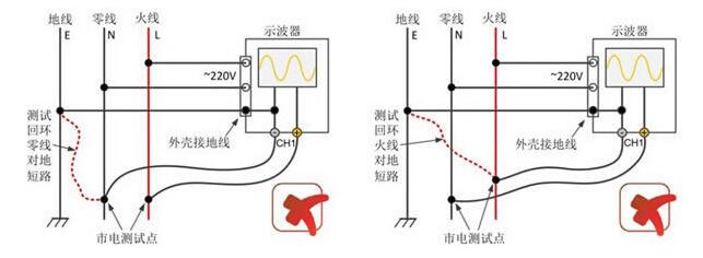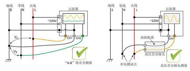 應(ying)用高壓差分(fèn)探頭測量市(shì)電,火線和零(líng)線測試點正(zheng)反接都沒關(guan)系,探頭内部(bu)通過高阻的(de)方式将測量(liang)端的地和示(shi)波器的地隔(gé)離開來,不會(huì)造成短路問(wèn)題,測量方式(shi)如圖5右所示。