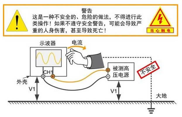 浮地測量(liàng)時,示波器外(wài)殼金屬端和(he)探頭接地端(duān)帶有同等電(dian)平。當測量市(shì)電時,外殼可(ke)能帶有220V的電壓(yā),人體一旦接(jie)觸到示波器(qi)外殼,電流會(hui)經過人體流(liú)入大地,非常(chang)危險!