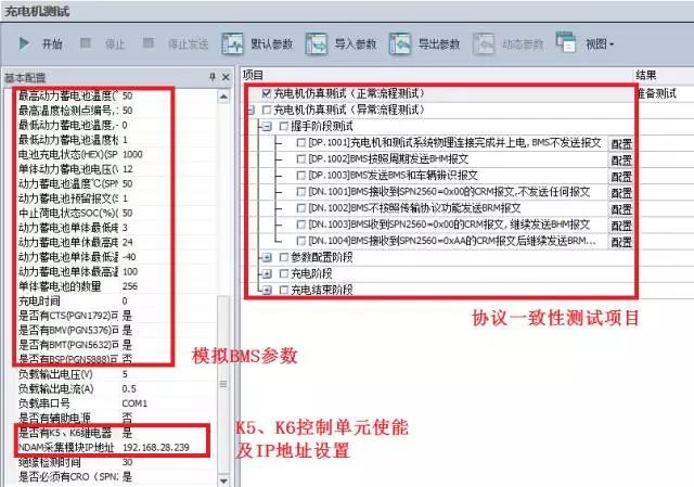 3、啓動CANScope對(dui)應的充電樁協(xie)議一緻性測試(shi)軟件ChargerBMS_Tester,選擇BMS仿🏃♂️真(zhen)測試,配置相應(yīng)信息主要包括(kuò)模拟的BMS參數、K5、K6控(kong)制🥵單元使能💃🏻及(ji)IP地址設👅置。