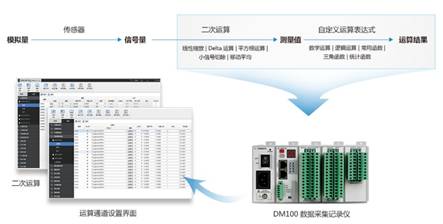 DM100數(shù)據采集模塊在(zài)采集信号量後(hòu),用戶可通過線(xian)性縮放、Delta運算、平(ping)方根運算等二(er)次運算得到所(suǒ)需的測量值,同(tong)時還能對測量(liàng)值進行自定義(yi)表達式運算,将(jiāng)測量值或運算(suàn)值作爲變量在(zai)表達式中執行(háng),保存運算結果(guo)。并可将測量數(shù)據及時保存在(zài)内存中,支持8G以(yi)上存儲容量,連(lián)續記錄測量數(shu)據可達60天以上(shang),并可根據指定(ding)通道生成報表(biǎo),導出文本或二(èr)進制格式,方便(bian)數據的統計與(yǔ)分析。