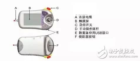 上圖是 ABB機(jī)器人示教(jiāo)器,其中A是(shì)示教器與(yu)控制櫃之(zhi)間的連接(jie)電纜,B是觸(chù)摸屏,C是急(ji)停開關,D是(shi)手動操縱(zong)杆,E是數據(jù)備份與恢(huī)複用 USB 接口(kou)(可插U盤/移(yí)動硬盤等(děng)存儲設備(bei)),F是使能按(an)鈕。