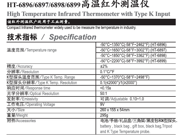 您(nin)的位置(zhi): 産品與(yǔ)服務 >> HT-6896/6897/6898/6899高(gao)溫紅外(wai)測溫儀(yi)