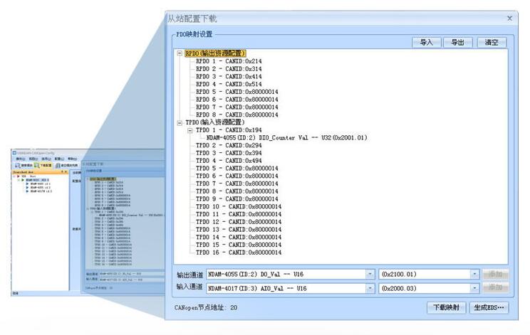 3.然後通過下載配(pèi)置,将采集模塊的(de)資源映射到CANopen的PDO上;