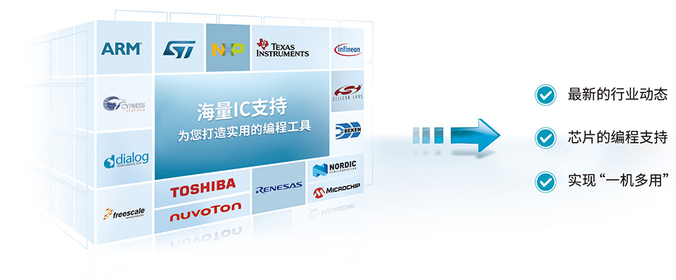 依(yī)靠着與各大(da)廠商的良好(hǎo)關系,現已支(zhī)持了各種🔱廠(chang)商的MCU,并且能(néng)夠準确、及時(shí)的提供各種(zhong)新芯片的編(bian)程支持,最大(da)化滿足客戶(hù)的需求。