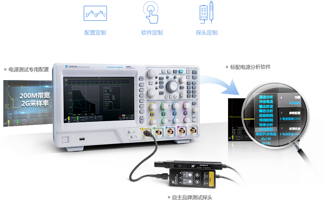 示波(bō)器作爲通用測試(shi)儀器,産品設計必(bi)須平衡不同行業(yè)的需求。電源測試(shi)以模拟信号爲主(zhǔ),很少測數字信号(hào)☂️。爲了解決通用示(shi)波器測量電源資(zī)源冗餘的問題,我(wo)們爲電源工程師(shī)量身定制了電源(yuán)測試專用版示波(bo)器,将電源行業最(zui)常用的📐200M帶寬、2G采樣(yang)率基于最優成本(ben)和行業需求優化(huà)至極緻。