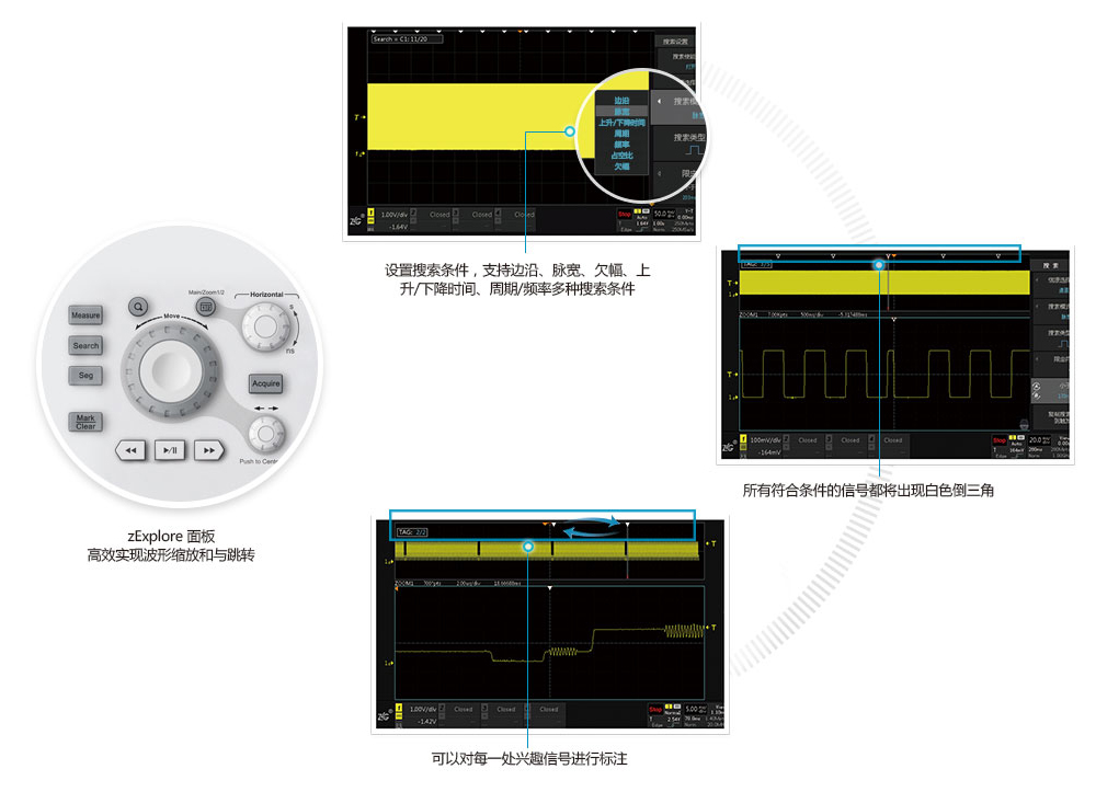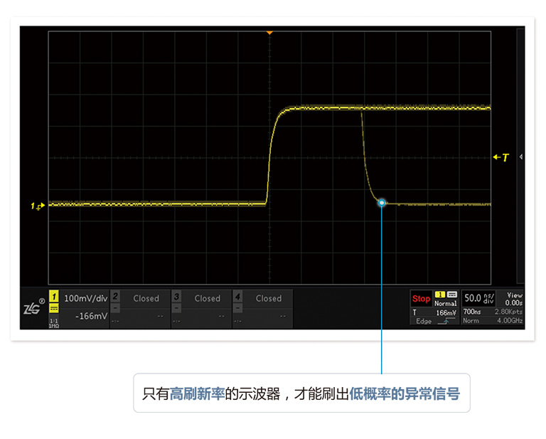 波形刷新率越(yue)高,死區時間就越(yuè)短。ZDS4000系列示波器,标(biao)配業界最高的1M次(ci)波形刷新率,配合(hé)模闆觸發,讓您最(zui)大概率的發現并(bìng)捕獲異常信号。