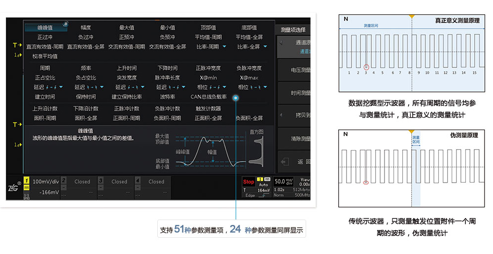 不同(tong)于傳統示波器隻(zhi)測一個周期,或通(tong)過抽樣減少數🈲據(ju)量再測量的模式(shi),ZDS4000系列示波器通過(guo)FPGA全硬件✍️并行處理(lǐ),基于原始采樣率(lǜ)和512Mpts全存儲深度,對(duì)每一☂️幀波形💰每一(yi)周期進行測量統(tǒng)計,僅需約1秒即可(kě)實現對512Mpts數據的“真(zhēn)正意義”參數測量(liàng),測試項✉️目可達51種(zhǒng),并且支持24種💁參數(shu)同時顯示。這與傳(chuan)統🐅意義示波器的(de)測量有着本📐質的(de)區别,也是示波器(qì)測試手段與測試(shì)方法的重大💋突破(po)。