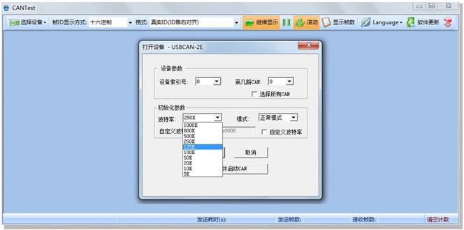 1.選擇(ze)設備波特率(lü)、通道号、工作(zuo)模式啓動CAN卡(kǎ)