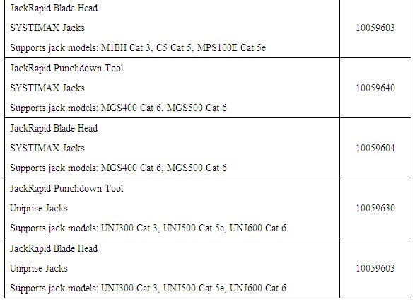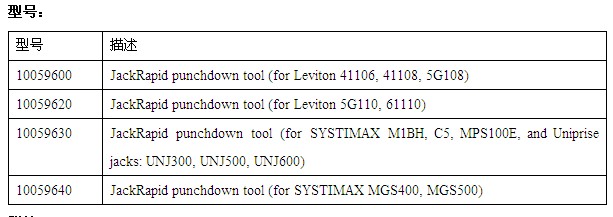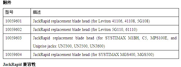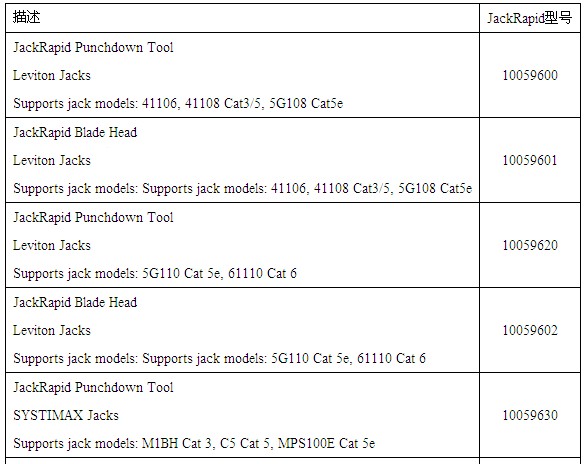 · JackRapid Systimax 和 Uniprise 刀片(紅色)支持(chí)以下插座:Systimax:M1BH、C5、MPS100E 和 Uniprise:UNJ300、UNJ500 和 UNJ600